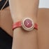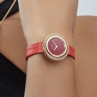 Women’s watch in rose gold and diamonds. Red carnelian dial. Rotating bezel. Interchangeable carnelian red alligator-skin strap. To celebrate life’s glorious moments, the turning rings of the Possession watch are illuminated with an ornamental stone dial in bold, vibrant colors. An icon in motion, this rose gold watch with a diamond-set bezel features a fiery red carnelian dial. Its matching carnelian red alligator-skin strap with a rose gold ardillon buckle incorporates an ingenious interchangeable system, allowing the wearer to change its style according to her mood. This luxury women's watch is exclusively available in Piaget Boutiques.