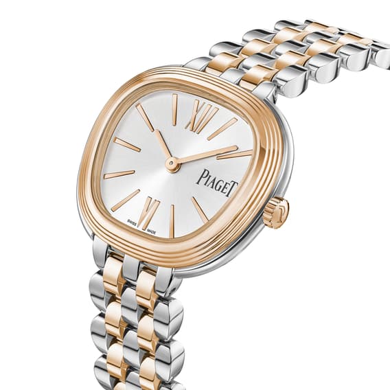 Sixtie reinterprets the trapeze-shaped watch with Piaget’s audacity and artistry. Inspired by the 1969 Swinging Sautoirs, the fluid design of this steel and gold watch shifts between trapeze, square and cushion forms — a free expression of Piaget’s play of shapes.
