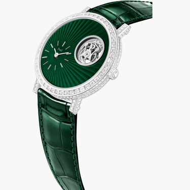 Montre tourbillon Altiplano en or blanc et diamants, abritant notre mouvement tourbillon 670P à remontage manuel. Version opulente en vert, cette montre ne manquera pas de faire des envieux. Toute notre expertise de sertissage sur une montre en diamants pour homme. Des diamants taille brillant, taille rose et taille baguette sont sertis sur cette montre pour un effet éblouissant. Le cadran est tout aussi opulent avec son émail vert « Grand Feu » et son motif guilloché soleil à la main. Notre signature, le chiffre 8 porte-bonheur, est représentée par la cage du tourbillon et le compteur des heures pour une montre de haute joaillerie infiniment intrigante. L'ensemble est complété par un bracelet en alligator vert. Une montre intemporelle et sophistiquée, extra-plate grâce à notre mouvement 670P. Découvrez un classique en couleur.