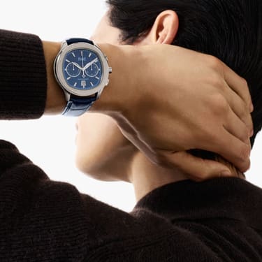 男士精钢计时腕表。蓝色表盘。蓝色鳄鱼皮表带。这款男士计时腕表尽显现代风范与优雅气质,适合各种场合佩戴。缎面抛光打磨表圈搭配直径42毫米的精钢表壳,防水深度达10巴,造型巧妙融合圆形与枕形,忠实延续伯爵传统美学风格。蓝色横向表盘上镶贴夜光时标,搭配太子妃指针和尖端饰以红色和镂空P字装饰的秒针,拥有中央小时、分钟、秒钟显示和计时功能,日期显示设于6时位置。透过蓝宝石水晶透明底盖可尽览精美的1160P自动上链机芯以及镌刻伯爵家族徽章的蓝色摆陀。这款高级精钢腕表搭配折叠式表扣蓝色鳄鱼皮表带。