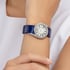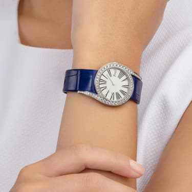 "ホワイトゴールド製ダイヤモンド付きレディースウォッチ。ラピスブルーアリゲーターストラップ。ピアジェが新たに創造したレディースウォッチ。光り輝き、心を揺さぶるほどに魅力的、それらの言葉を見事に表現した時計。 このモデルは従来の直線から時を自由に解き放ち、絶対的な女性らしさを持った曲線の中に収めました。この32mmのラウンドケースは、ケースの外側にまで優美に伸びたふたつのラグによってその美を高め、その官能的なシルエットは、ラウンドカットダイヤモンドが流れるようにセットされたベゼルにより強調されています。洗練されたアリゲーターストラップにマッチしたブラックのローマ数字を特徴とするそのピュアで控えめな文字盤は、今の時代を反映させた究極の女性らしさに溢れます。"