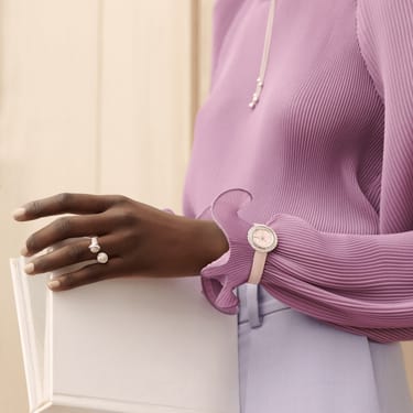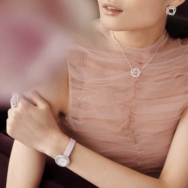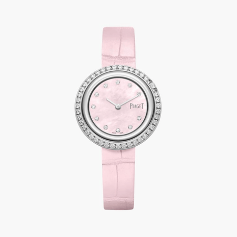 絶え間なく変わる表情が魅力的なピアジェのアイコン、POSSESSION。29mmの18Kホワイトゴールド製ケース、ピンクのアリゲーターストラップ、マザーオブパールの文字盤を採用したモデルです。56Pピアジェ自社製クオーツムーブメントを搭載し、スイスで製作。ベゼルと淡いピンクのマザーオブパールを用いた文字盤にジェムセッティングが施された比類のないウォッチが、洗練された装いを完成させます。ピンバックル付きのストラップは付け替えが可能。遊び心あふれるPOSSESSIONの象徴である回転ベゼルが柔らかな光沢のある文字盤の周りを回転するたび、精緻にカットされたダイヤモンドが光をとらえて輝きます。身に着けるたび、ときめきと喜びをもたらしてくれるタイムピースです。