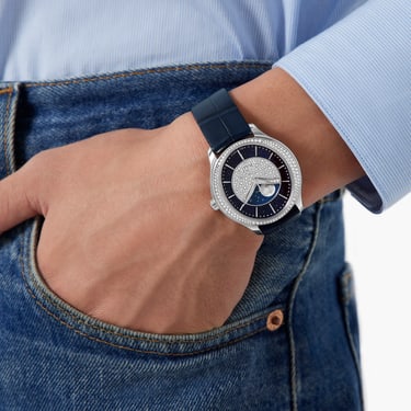 Moon phase watch in white gold and diamonds. Blue aventurine glass diamond-paved dial. Blue alligator-skin strap. The elegant lines of this women’s complication watch mingle different shapes. A round 36 mm white gold case, a round dial with an oval opening and a bezel set with gradient diamonds serve to showcase the exclusive watch complication: the moon phase. This function appears in a diamond-paved aperture at the heart of a blue aventurine glass dial marked by gold appliqué hour-markers, sword-shaped hands and a delicate star trotteuse hand. Meanwhile the Manufacture 584P self-winding movement and its black oscillating weight can be admired through the piece’s sapphire crystal case back. Aventurine glass, also known as goldstone, takes its name from the Italian word “avventura,” meaning adventure. Dating back to the 17th century, its manufacturing process was supposedly discovered in Murano, near Venice. It consists in adding copper oxide to the glass to give it its glittering appearance, mirroring a deep-blue and starry night sky.