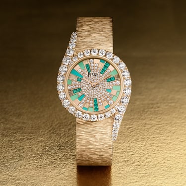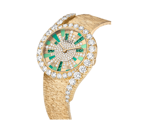 Limelight Gala Precious腕錶,直徑32毫米。18K玫瑰金錶殼,鑲飾42顆明亮形切割圓形美鑽(約4.74克拉)。細工鑲嵌錶盤,鑲飾157顆明亮形切割圓形美鑽(約0.73克拉)、13顆方形切割祖母綠(約0.86克拉)和14顆綠玉髓(約0.33克拉)。18K玫瑰金Decor Palace(宮廷式裝飾)錶鏈。錶廠製501P1自動上鏈機械機芯。