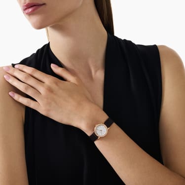 The Altiplano collection, synonymous with highly elegant ultra-thin watches, plays the femininity card in a new format. This tiny watch, with a diameter of 24 mm, displays a face denuded of all superfluous elements. On the slightly iridescent white dial, the hour markers have a particularly soft color. A circle of diamonds, set on the gold case, adds a touch of sophistication. A luxury watch for women, full of freshness, available in rose gold on a brown satin strap.