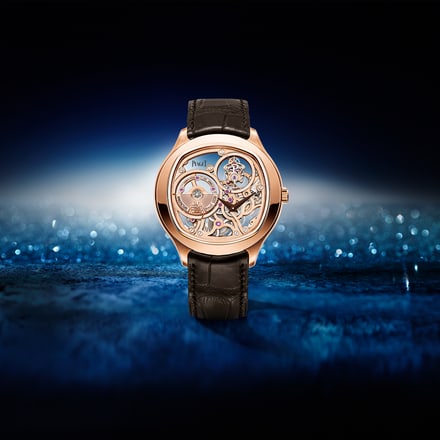 Finishing:Platinum oscillating weight engraved with the Piaget coat of arms, Back: Circular côte de Genève from the center of the generator, Black and polished silver generator bridge, Front: Sunburst guilloché and satin-brushed mainplate from the hours and minutes, Circular-grained mainplate and bridges, Circular satin-brushed wheels and sunburst satin-brushed barrel cover, Silvered screws
