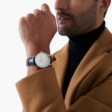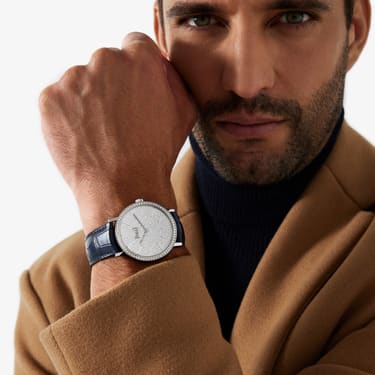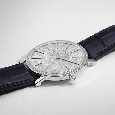 Experience the ultra-thin with this 40 mm Altiplano watch in white gold and diamonds with our impressive 1200P calibre. A Swiss watch with a fully paved dial with brilliant-cut diamonds demonstrates Piaget’s record-breaking craftsmanship and refined gem-setting skills for an inspired finish. A watch of fine details, from the classic circular form and applied white gold hour markers to the black shading on the blue alligator strap, every segment comes together to create a timeless icon that captivates the wearer. Self-winding ultra-thin movement, interchangeable straps and an oscillating weight, this diamond watch is truly imbued with Piaget's DNA. The centrepiece to any watch collection, make it yours and enjoy the innovation and skill that will enrich your wrist.