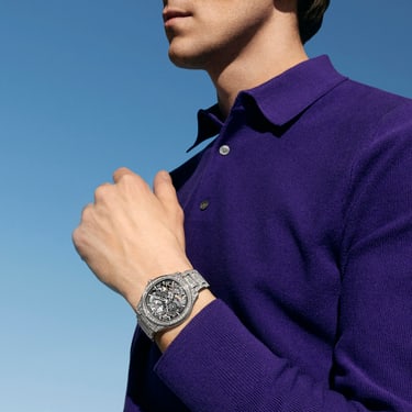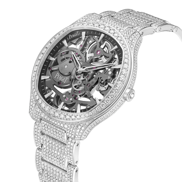 Piaget brings its skeleton expertise to the Piaget Polo diamond skeleton watch. Every component of the Piaget Polo Skeleton has been reimagined and reduced to achieve a watch that is undeniably audacious and bold. Paired with radiant aesthetics, a white gold case, brilliant-cut diamonds, and a fully-paved bracelet, this skeleton watch dazzles inside and out. With each gaze into this diamond luxury watch, a new detail reveals itself.