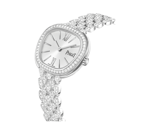 Sixtie watch, 29 mm. Trapeze-shaped case in rhodium finish 18K white gold set with 51 brilliant-cut diamonds (approx. 0.52 ct). Silvered solar satin-brushed dial. Bracelet set with 380 brilliant-cut diamonds (approx. 4.42 cts). Crown set with 1 rose-cut diamond (approx. 0.06 ct). Piaget 57P quartz movement.